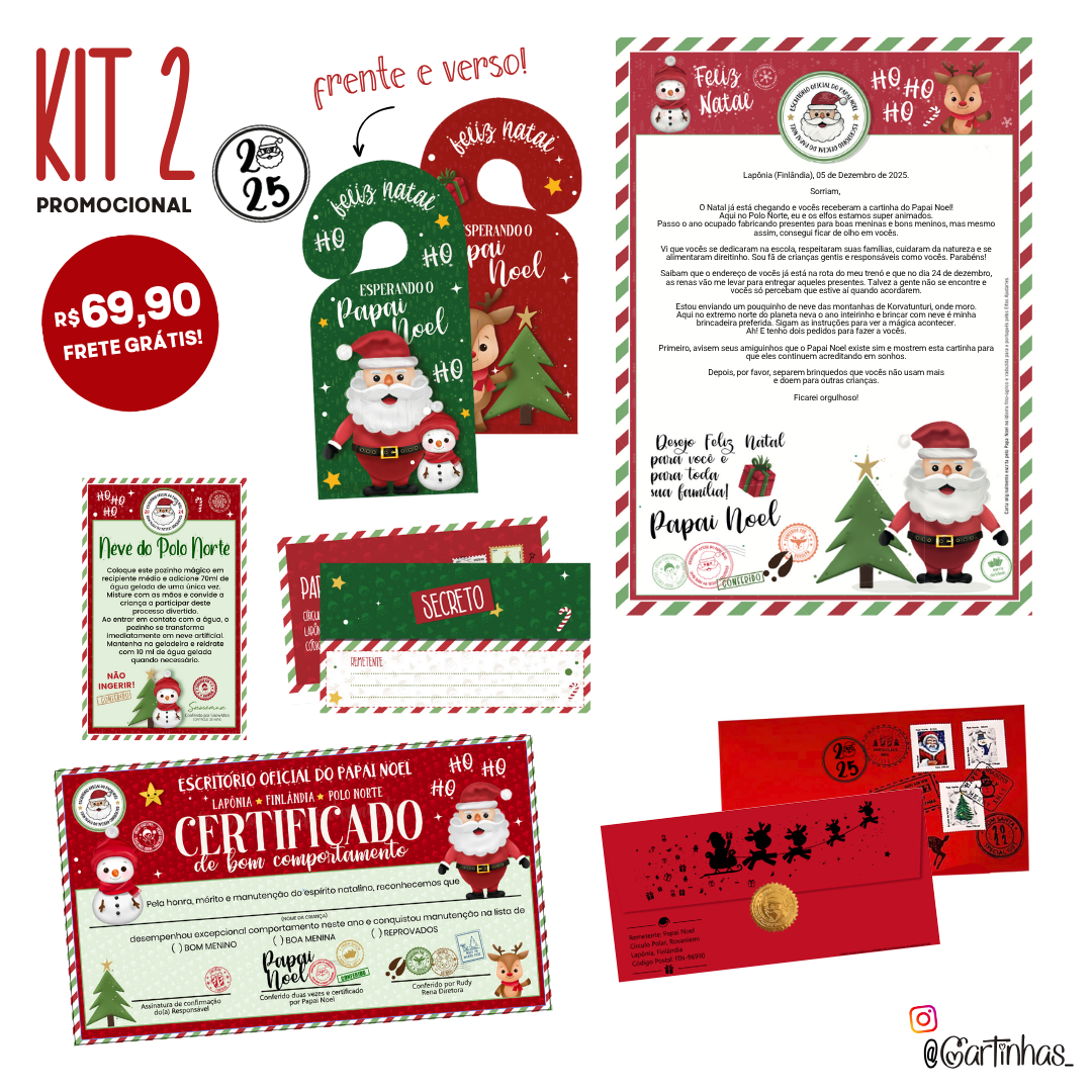 Além da carta e do envelope personalizados, este kit econômico contém 4 presentinhos, mas temos kits com pacotinhos de neve extra e mais brindes agregados para a brincadeira ser ainda mais divertida!